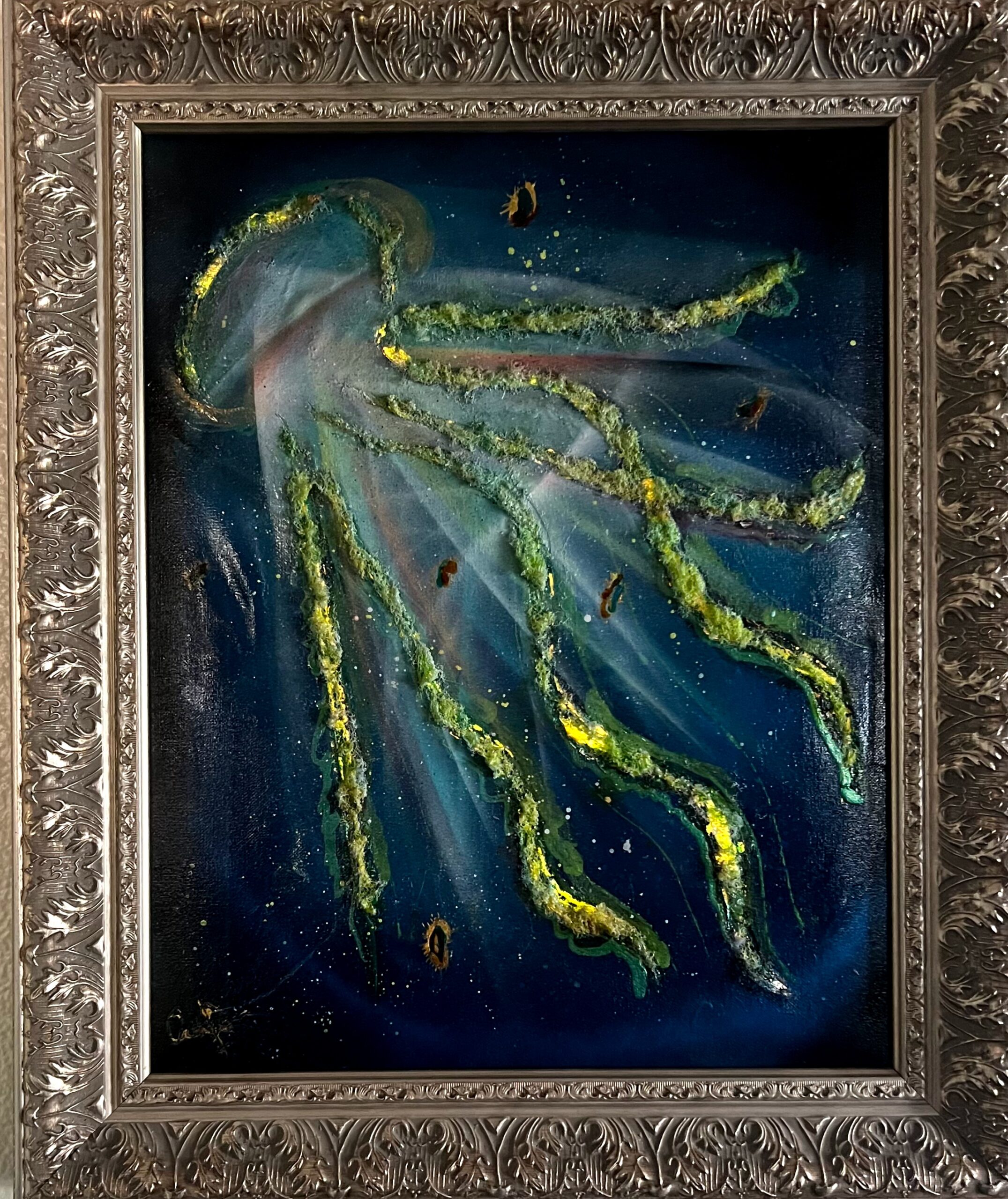 I use many different mediums, such as oils, tattoo ink, spray paint, acrylics, and water colors. I'm a shiny squirrel kinda gal, all the mediums, at any point. No rhyme, no reason, just beautiful chaos!